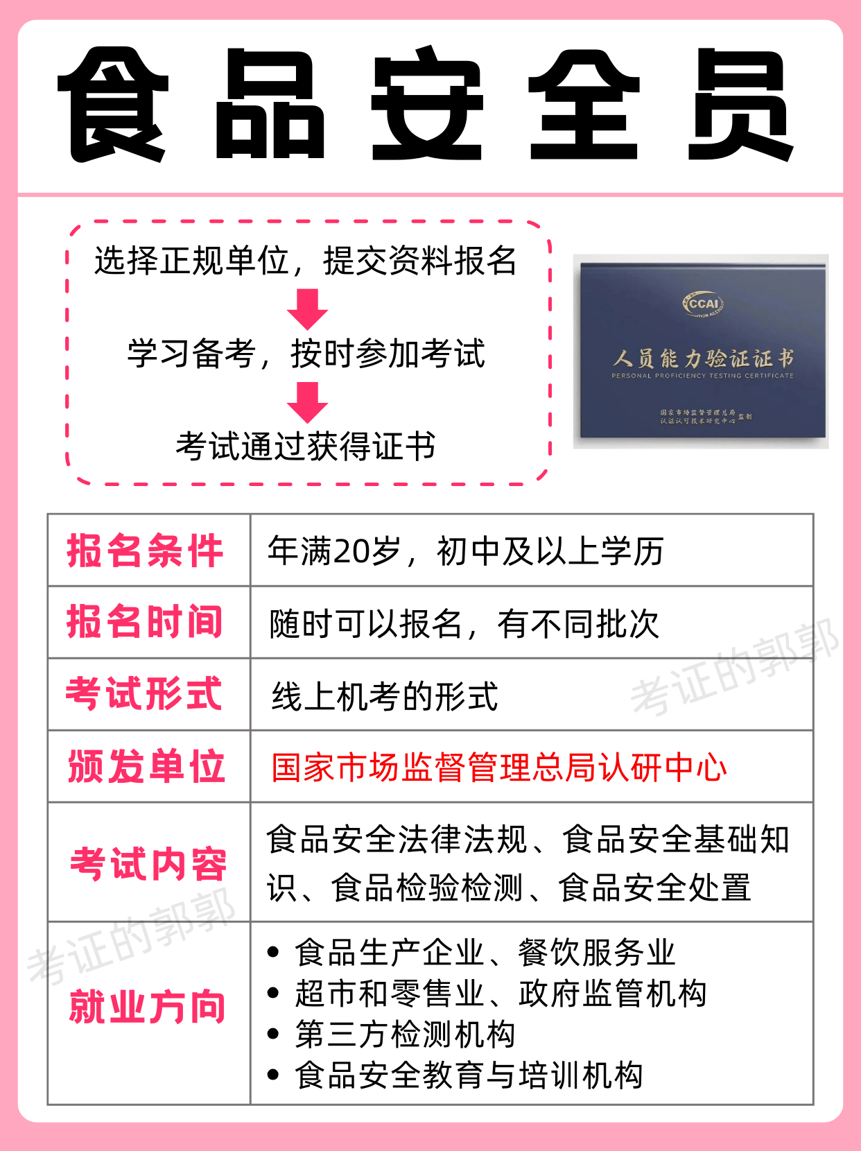 跟着人们对于食物平安更加留意,食物平安员证书的出证单元有国市监认研究中.心、食物工业协会等,对于食物平安办理方面从业者岗亭持续添加,外行业内有承认度,