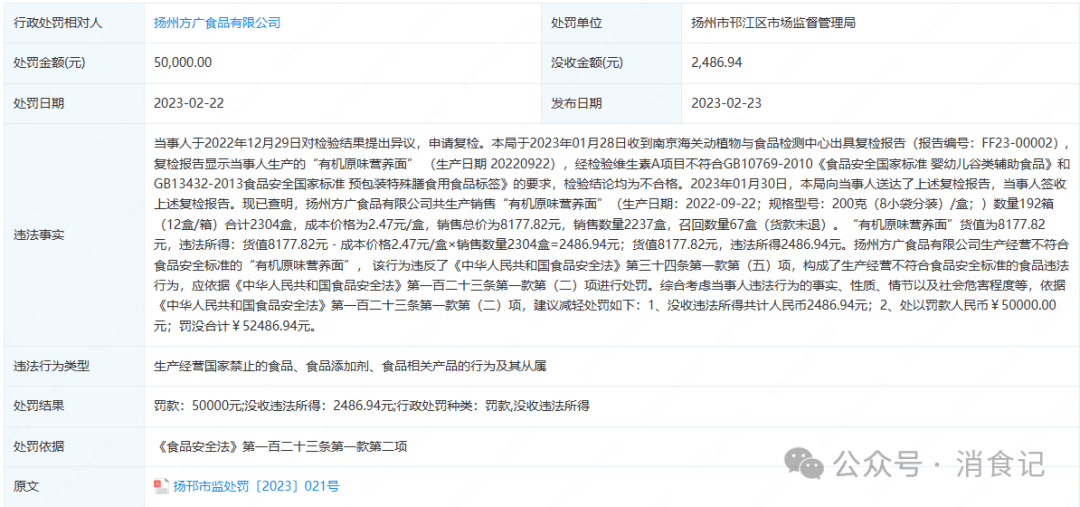 惩罚消息显示,其暗示,无机原味养分面“维生素A”项目不及格。