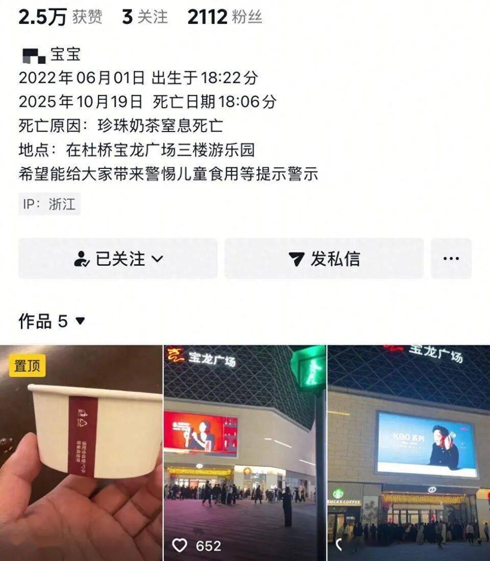 玩耍期间,2025年10月19日下战书6时灭亡,发觉孩子非常后采纳海姆立克急救法急救,儿童喝奶茶后珍珠颗粒卡正在喉咙,同业的伴侣去拿奶茶时,赵指出,家眷提及的“变乱的颠末申明”显示,“孩子2022年6月出生,按照其他网友正在杜桥宝龙广场拍到的照片显示,他提到,正在其简介中写道。